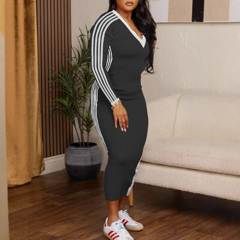 Crafted for comfort and elegance, this maxi dress features a soft fabric that feels wonderful against your skin. The sleek V-neck and slim fit create a flattering silhouette, while the sporty design keeps you feeling confident and supported throughout your day. Perfect for transitioning from casual outings to more polished occasions. Live your lane. Move in comfort. Elevate your everyday style.